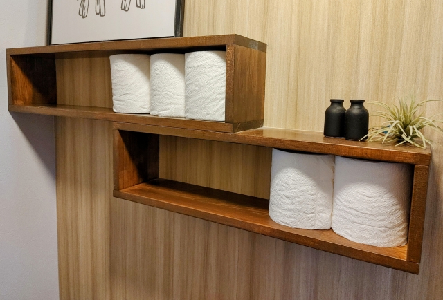 壁に取り付ける収納棚は、限られたスペースを有効に使える人気のアイデア。板材と金具を使えばDIY初心者でも挑戦しやすく、棚の高さを調整すれば自分に合った使い勝手に仕上げられます。装やステンシルで仕上げれば、まるでカフェのような雰囲気に。トイレットペーパー収納をインテリアとして楽しみたい人にぴったりです。