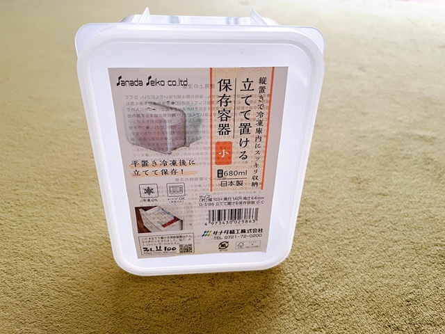 保存容器のサイズは、手の平にのる程度。厚みも3cmもなく、冷凍庫で場所を取らず保存できるのもうれしい。フタ付きなので重ね置きもOK。まとめて作りたいときにも便利です。